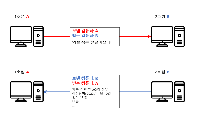 각 컴퓨터는 데이터를 주고받는 형식을 지정할 수 있었는데, 2호점에서는 엑셀의 데이터를 제목, 작성날짜, 형식, 내용 순서로 보냈다.