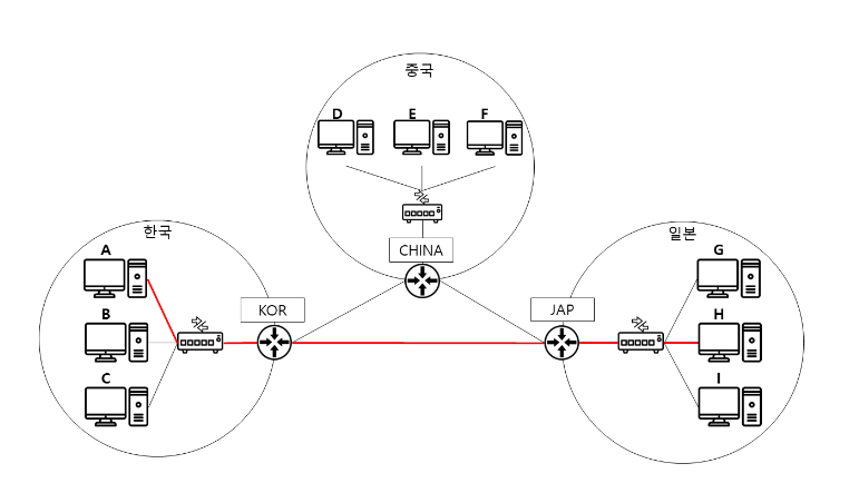 네트워크에 통달한 김씨는 이제 각 나라를 연결하여 데이터 통신이 가능해지도록 해야했다. 처음 떠올린 방법은 각 나라의 스위치를 모두 서로 연결하는 것이었다. 그러나, LAN 내부에서 1개씩만 스위치가 늘어나게 되더라도, 엄청나게 복잡해질게 뻔했다.