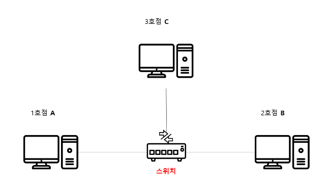 하지만 문제가 모두 해결된 것은 아니었다. 2호점에서 사과가 많이 팔리는 것을 알게 된 김씨는 컴퓨터 네트워크를 통해 2호점으로 메시지를 보내게 되었다. 그런데, 그만 그 메세지가 허브에 연결된 3호점에게도 전달되었다. 3호점에선 잘 필리지도 않는 사과 물량을 늘려 버린게 된 셈이다.