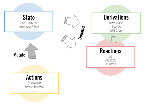 총 4가지의 핵심 개념, State, Derviations, Reactions, Actions가 있다.