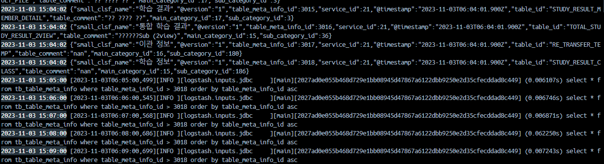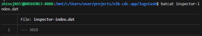 bat 을 사용하여 inspectore-index.dat 파일 구성 완료 후, logstash를 실행하면 — 뒤의 0 값이 다음과 같이 3018, 즉 가장 마지막으로 읽은 id 값으로 변경될 것 이다.
