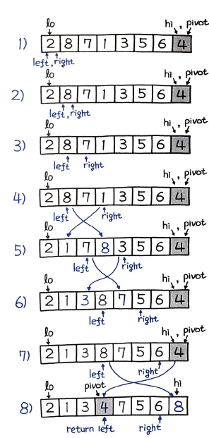 이 그림에서 보듯이 오른쪽 right 포인터가 이동하면서 피벗의 값이 오른쪽 값보다 클 때, 왼쪽과 오른쪽의 스왑이 진행된다. 스왑 이후에는 왼쪽 left 포인터가 함께 이동한다. 여기서 피벗의 값은 4이므로, 오른쪽 포인터가 끝에 도달하게 되면 4 미만의 값은 왼쪽으로, 4 이상인 값은 오른쪽에 위치하게 된다. 그리고 왼쪽 포인터의 위치로 피벗 아이템이 이동한다.