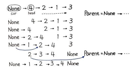 cur = parent찾은 cur 위치 다음에 head가 들어가고, head.next 에는 cur.next를 연결해 계속 이어지게 한다. 그리고 다음번 head는 head.next 로 차례를 이어받는다. 이후에는 cur = parent를 통해 다시 처음으로 되돌아가며, 차례대로 다시 비교하게 된다.