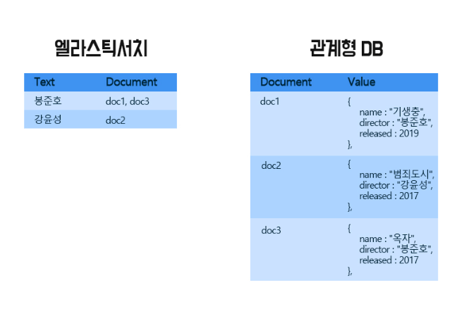- RDB는 특정 value를 찾기 위해 특정 테이블의 모든 레코드를 보면서 체크하지만, ES에서는 특정 텍스트 값 기반으로 이미 어떤 Document에 포함되어 있는지 색인이 되어 있어서, 찾는 속도에서 차이가 날 수 밖에 없다.