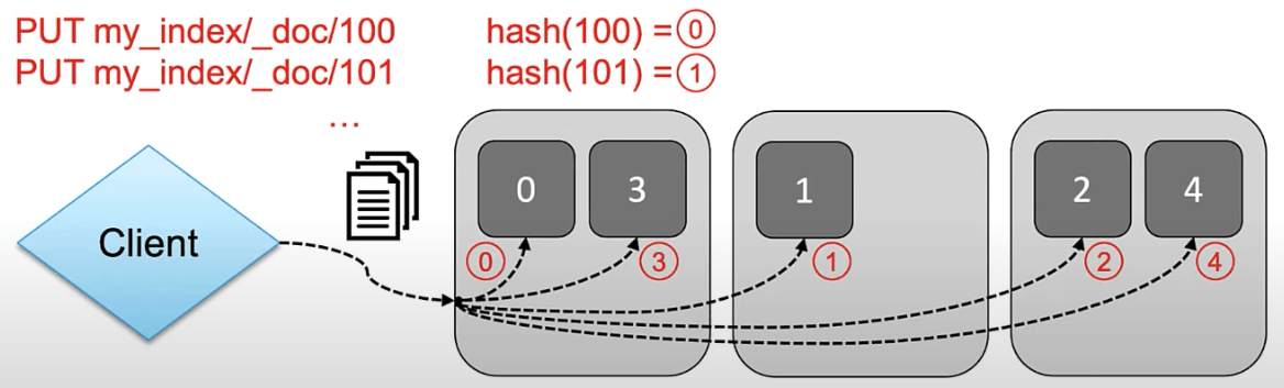 my_index라는 index가 존재하고 5개 shard로 되어 있다고 가정해보자. 데이터를 넣을 때 마다 doc id를 지정했는데, 그 id를 hash한 result에 해당하는 shard의 number로 RR 방식으로 적재된다. -