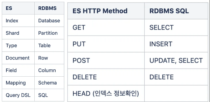 - RDBMS의 물리와 논리 단위를 ES와 비교하여 정리한 표이다.