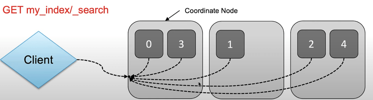 검색을 할 떄도 요청을 받은 노드가 해당되는 모든 샤드에 검색 명령을 전달한다. 최초로 검색 전달을 받은 노드를