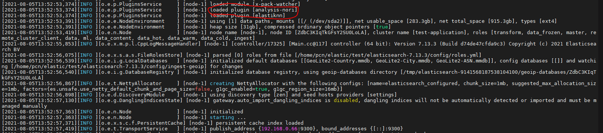 ./bin/elasticsearch-plugin install analysis-nori설치 후, ES 실행 시 다음과 같이 나오면 정상적으로 Nori가 구동되고 있다는 것