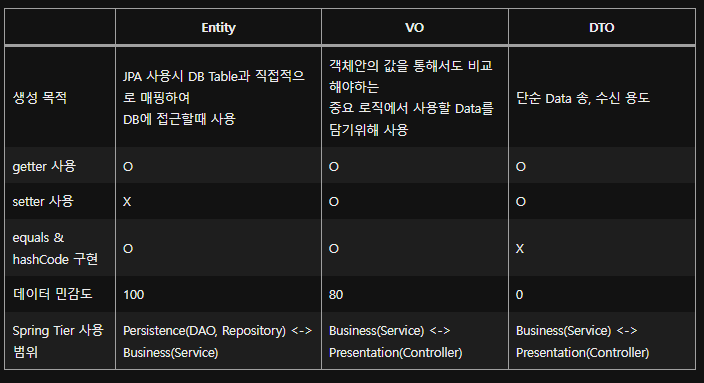 현장실습 떄 진행하는 데이터 포털 웹 서비스 프로젝트에서 모든 응답 관련 객체들을 DTO로 통일하고 있었다. 그런데, 말로만 듣던 Entity나 VO는 이럴 때 쓰는 거 아닌가? 라는 생각이 들어서 찾아보았다.